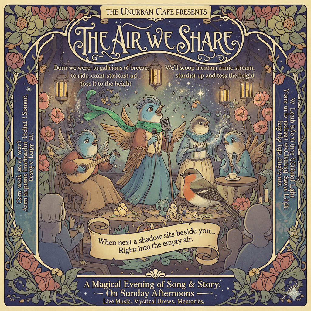 We Songbirds came to spin in joyful dance, to lift a mighty, joyous call, To paint the strange and winding streams of moments that befall.